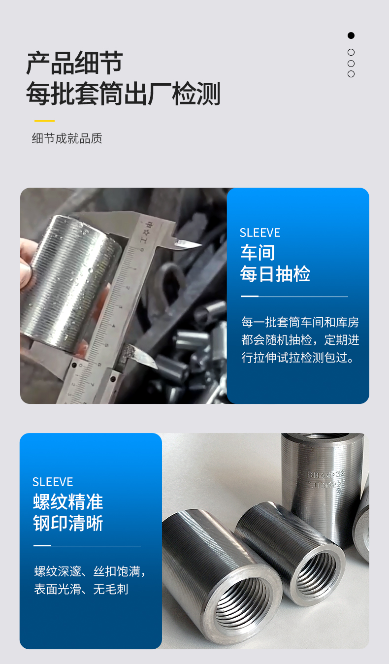 便于檢測:施工時不需要用特定檢測設備,只需看鋼筋外露絲牙情況即可測定接頭的質量。