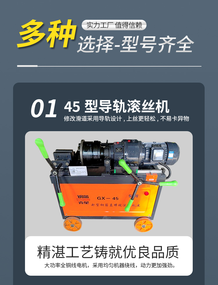 鋼筋直螺紋滾絲機是近年來廣泛用于建筑行業的一種鋼筋加工機械。它就把鋼筋端頭部位一次快速直接滾制使紋絲機頭部位產生冷性硬化,從而強度得到提高,使鋼筋絲頭達到與母材相同。由機架、夾緊機構、進給拖板、減速機及滾絲頭、冷卻系統、電器系統組成。