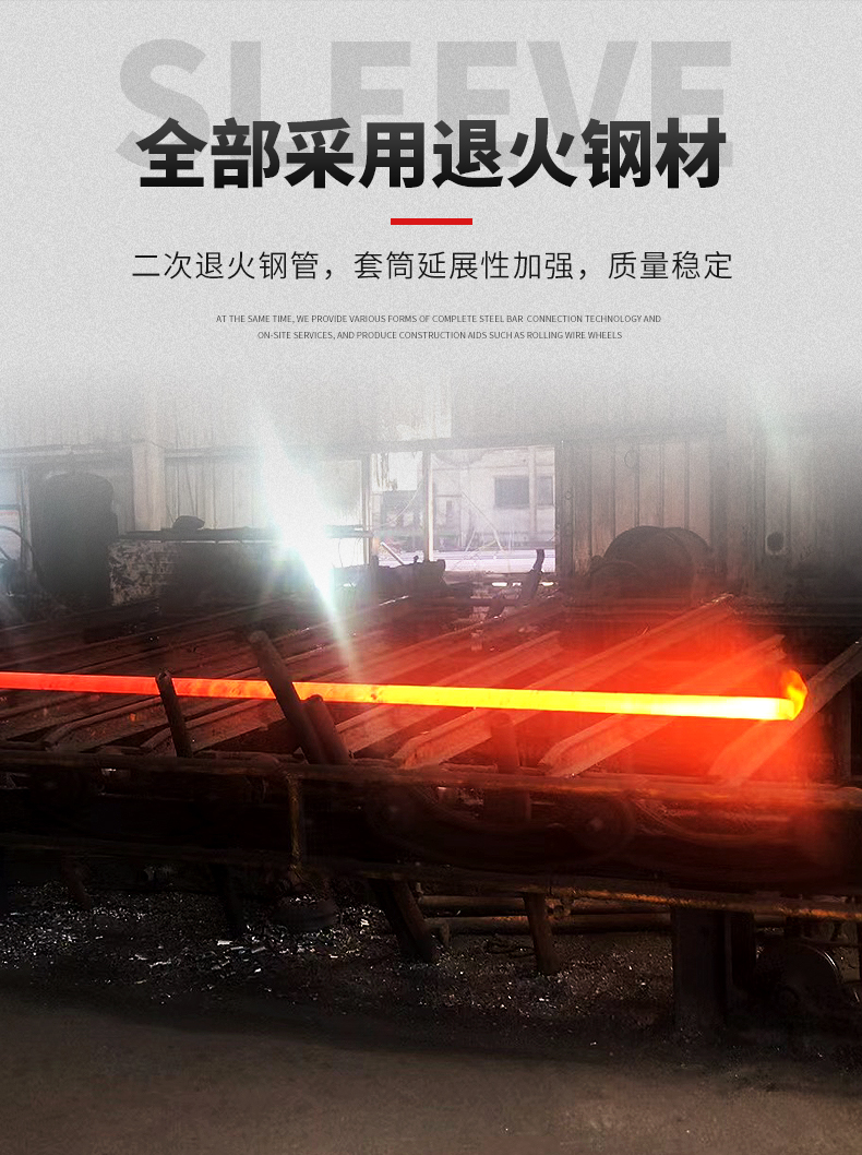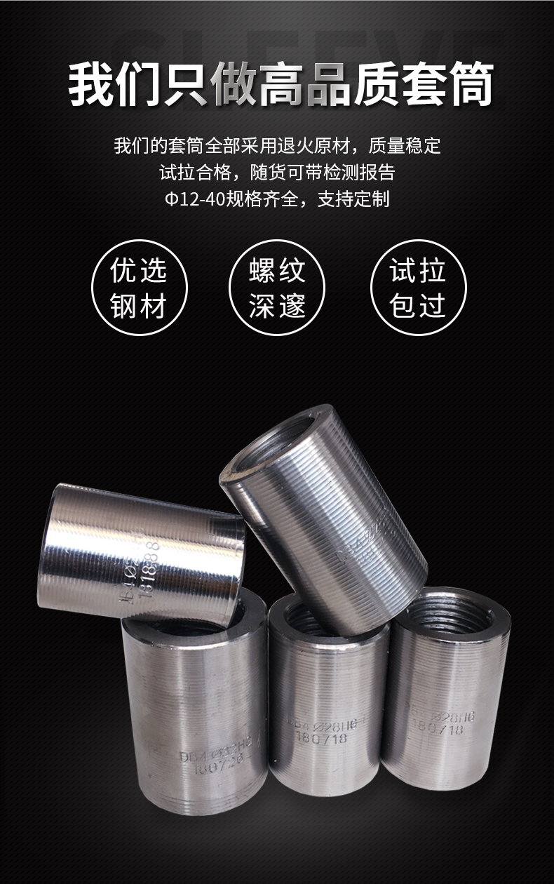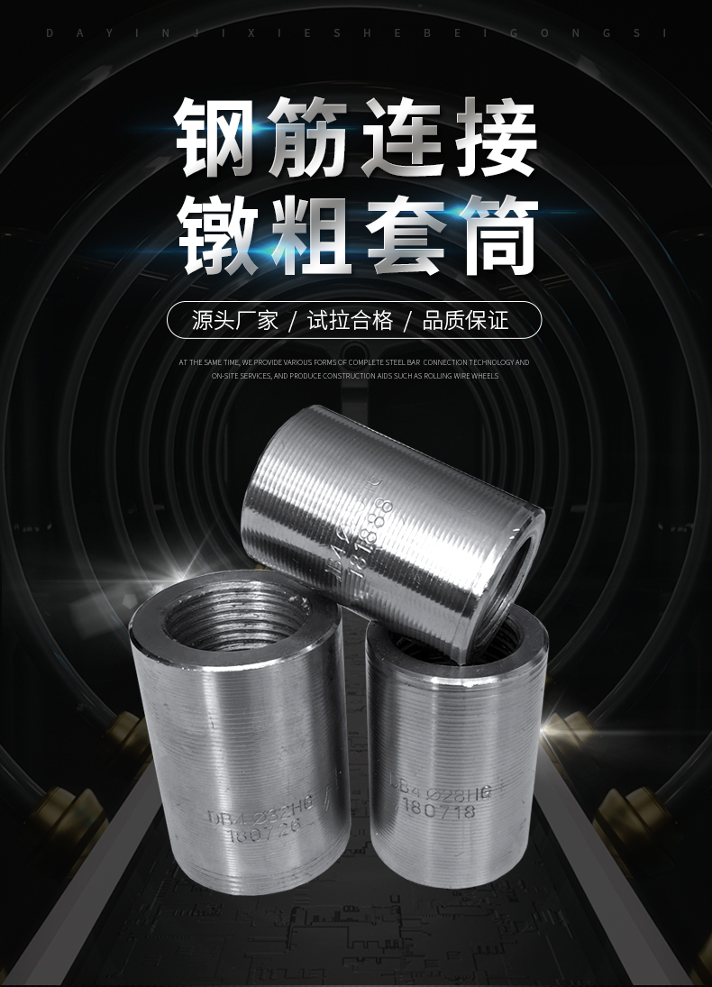 三、直螺紋連接接頭:等強度直螺紋連接接頭是二十世紀90年代鋼筋連接的國際新潮流,接頭質量穩定可靠,連接強度高,可與套筒擠壓連接接頭相媲美,而且又具有錐螺紋接頭施工方便,速度快的特點,因此直螺紋套筒連接技術的出現給鋼筋連接技術帶來了質的飛躍。目前我國直螺紋連接技術出現百花齊放的景象,出現了多種直螺紋連接形式。直螺紋連接技術主要有鐓粗直螺紋連接接頭和滾壓直螺紋連接技術。這兩種工藝采用不同的加工方式,增強鋼筋端頭的承載能力,達到接頭與鋼筋母材等強的目的。